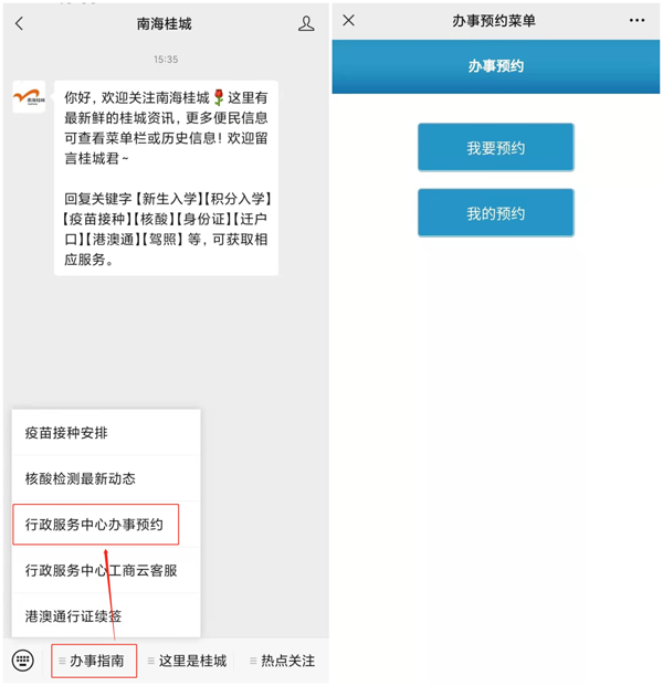 2.点击聊天对话框底部的菜单栏【办事指南】-【行政服务中心办事预约】进入办事预约页面,点击【我要预约】。