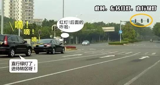当同向直行方向绿灯、左转方向红灯时,车辆就可以驶入待行区等待。