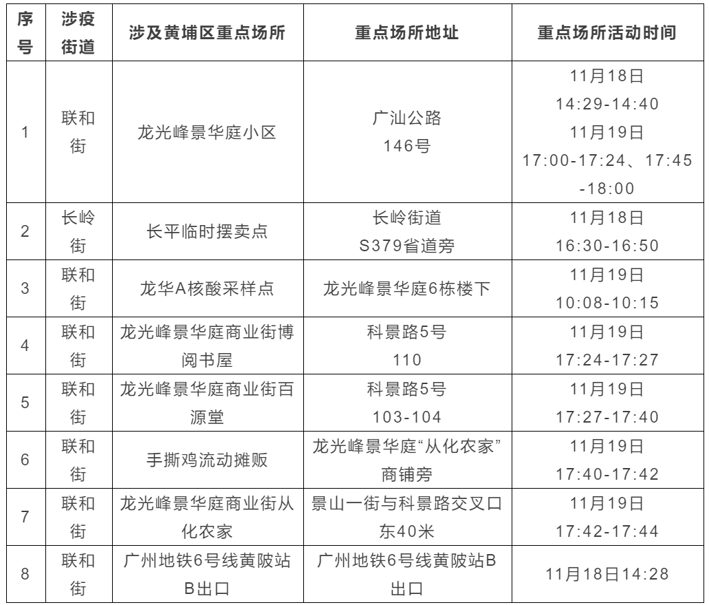 11月20日,黄埔区在外省返埔重点人群筛查中发现1例核酸检测异常人员。根据国务院联防联控机制《关于进一步优化新冠肺炎疫情防控措施科学精准做好防控工作的通知》和我区疫情防控需要,经区新型冠状病毒肺炎疫情防控指挥部研究决定,自2022年11月20日起对联和街以下区域实施临时管控: