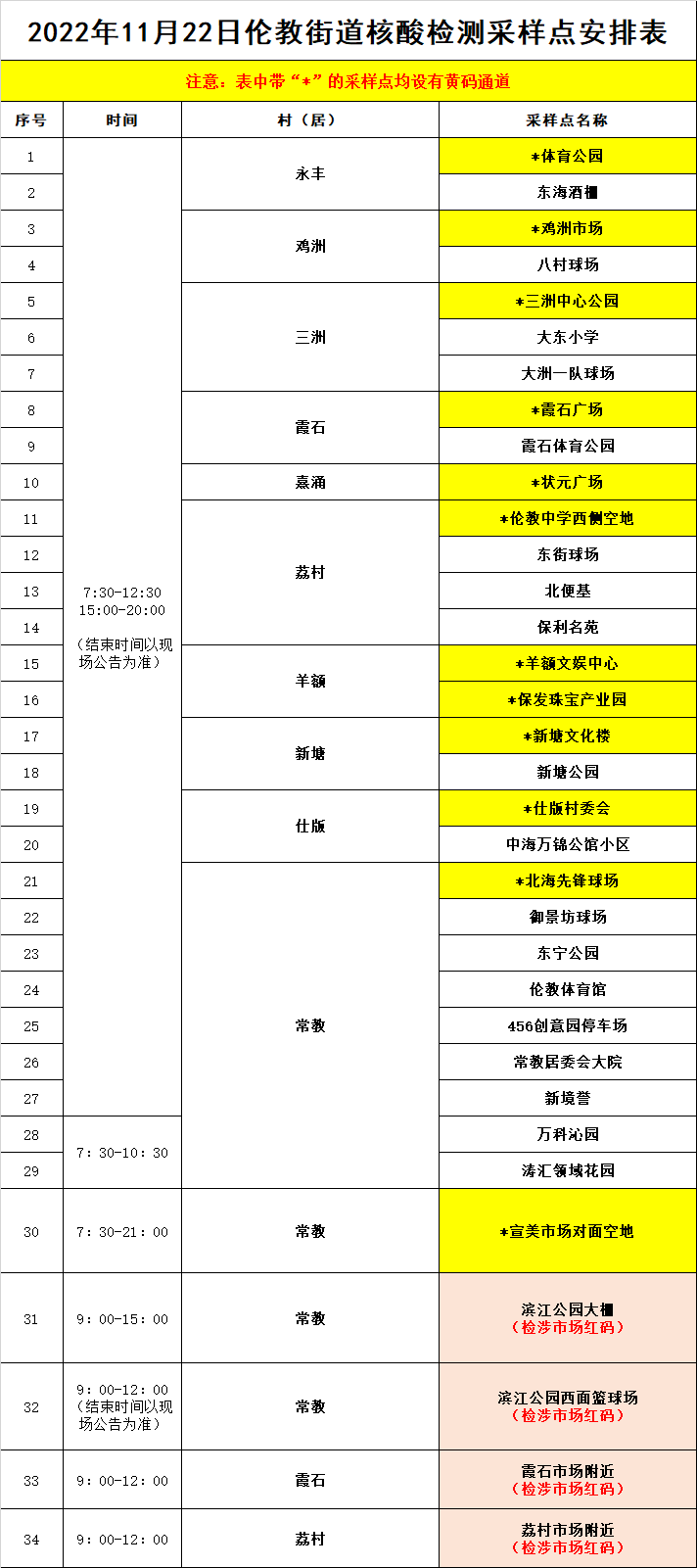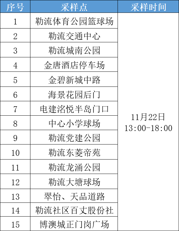 因周二(11月22日)伦教街道继续开展全员核酸检测工作,部分常态化便民核酸采样点暂停提供服务。具体开放情况请看下图,如有调整,请以现场公示为准。