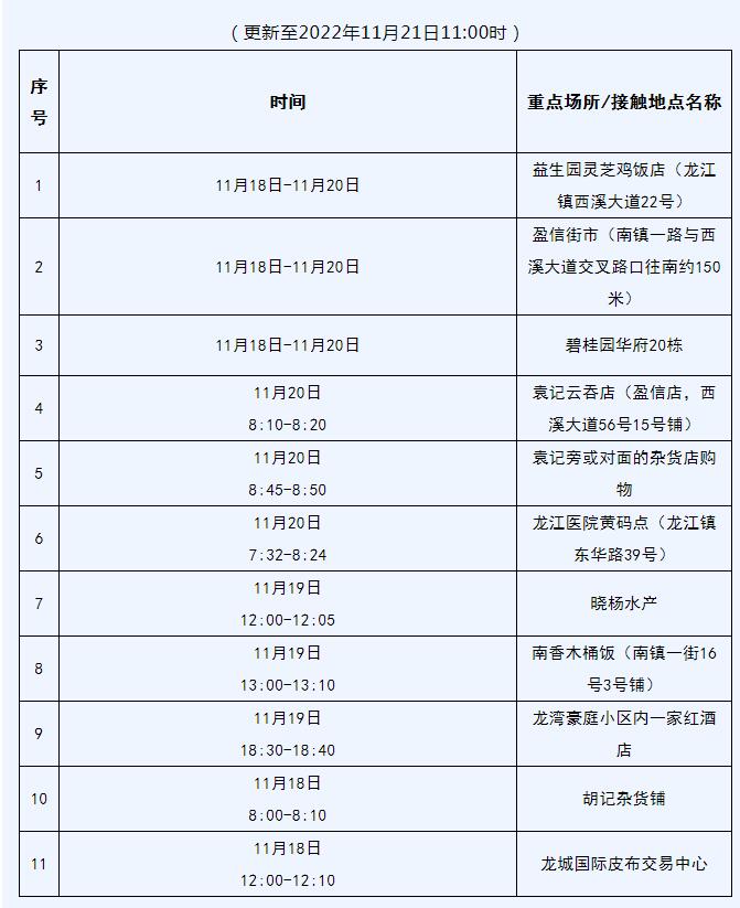 因疫情防控需要,在相关时段到过以下重点场所的人员,请立即主动向居住地社区、工作单位或居住酒店报备,并配合做好医学隔离观察、健康监测等健康管理措施。重点场所名单见下表,后续将按实际情况更新。