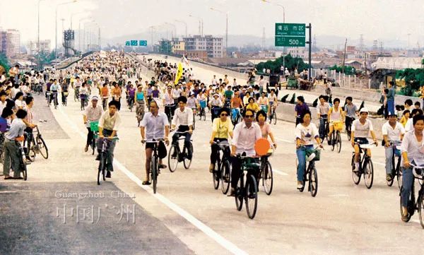 广佛高速率先在全国实行“贷款修路、收费还贷”。图为1989年8月1日举行的“万人单车行”活动。/佛山市交通局供图