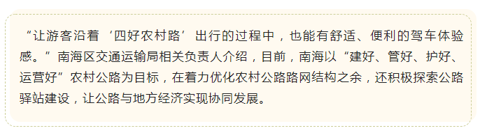 自驾道路是美景,自驾赶路成享受。如今,南海区已打造多个颜值高、配套设施全、有特色的公路驿站,从而完善一条道路,形成一片风景,带动一批产业,造福一方百姓。南海区交通运输局相关负责人表示,接下来,南海区将继续在加大路网建设力度的基础上,全面提升农村公路服务能力和品质,让“四好农村路”变成南海的文化展示路,经济腾飞路,绿色生态路。