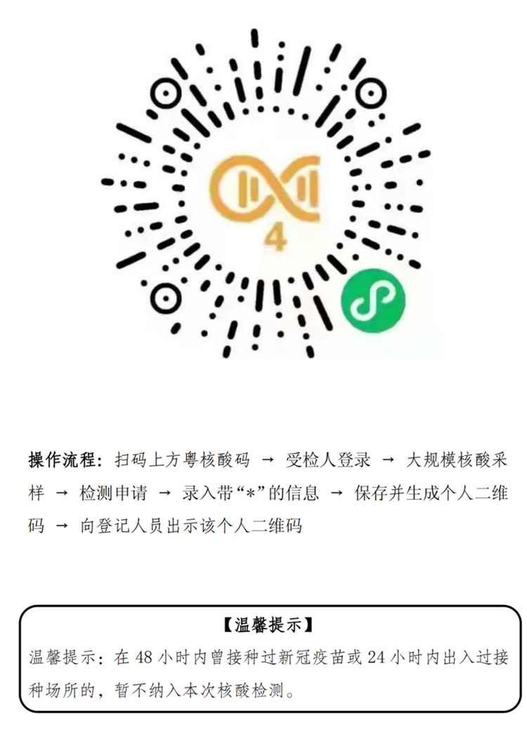 六、请广大市民提前通过“粤核酸4”微信小程序登记个人及家人信息,并截图保存“个人采样信息二维码”“粤康码”和“行程卡”,以提高信息采集效率。有条件的外出请尽量佩戴N95口罩。