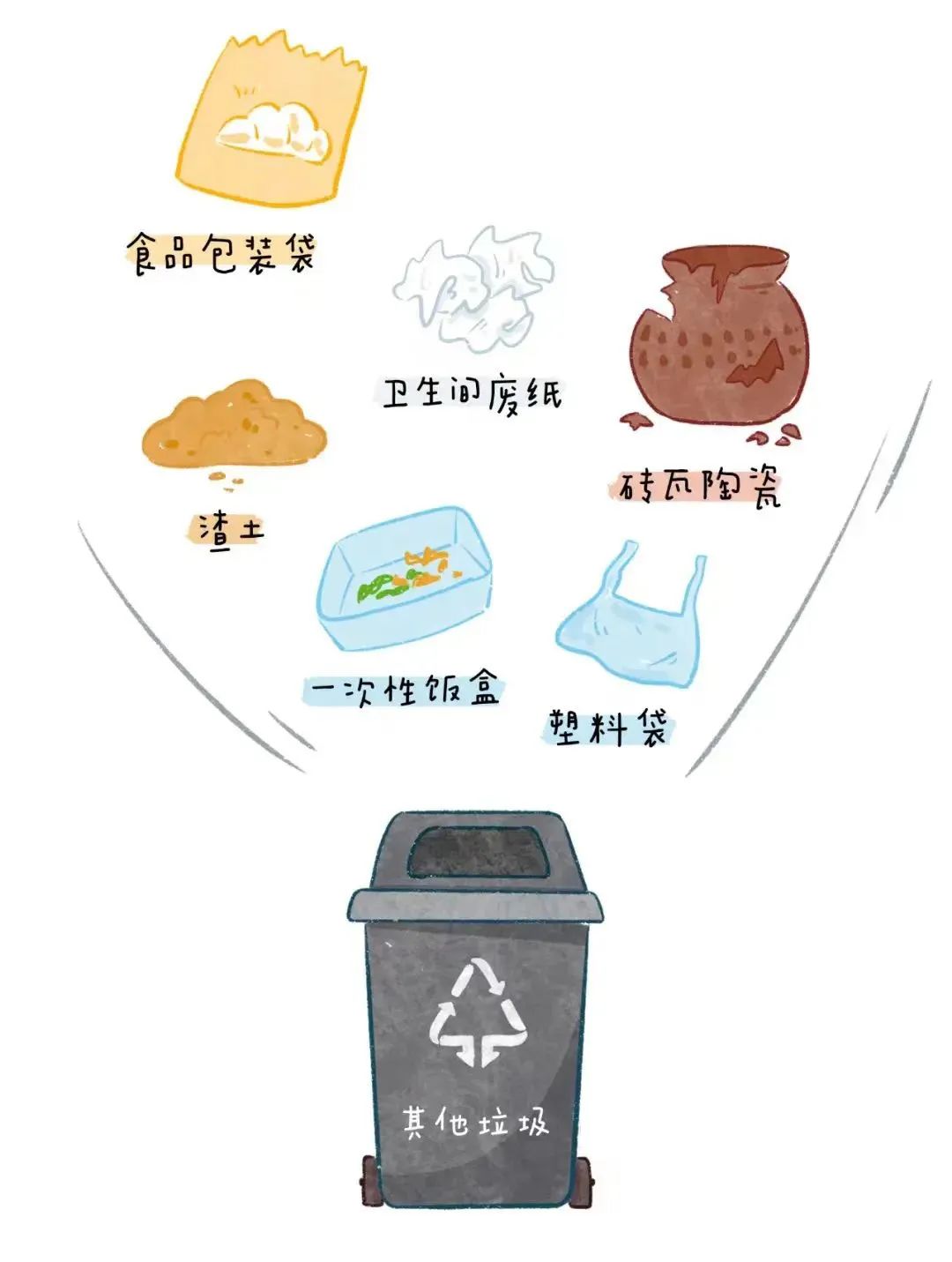 其他垃圾,是指除以上几类垃圾之外还有砖瓦陶瓷、渣土、塑料袋、纸巾等难以回收的废弃物。