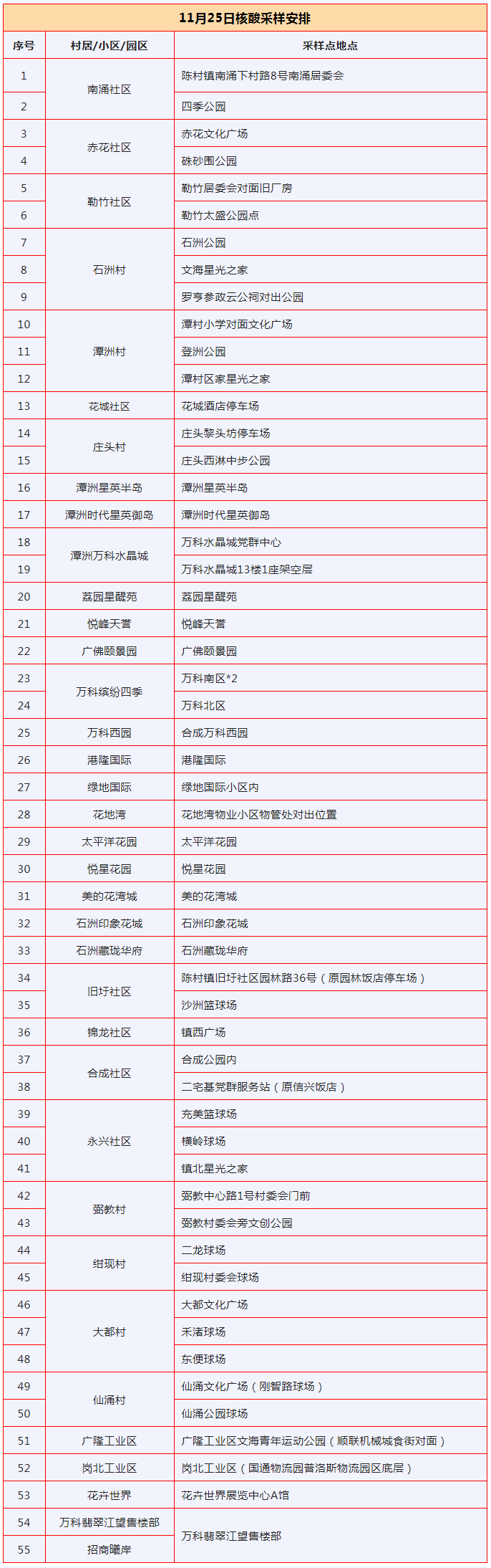 为进一步做好伦教街道新冠疫情防控工作,切实保障广大人民群众身体健康和生命安全,降低新冠肺炎疫情传播风险,伦教街道现定于2022年11月25日07:00-14:00继续在辖区内分批加强便民核酸检测(小区采样结束时间待定)。现将有关事项通知如下: