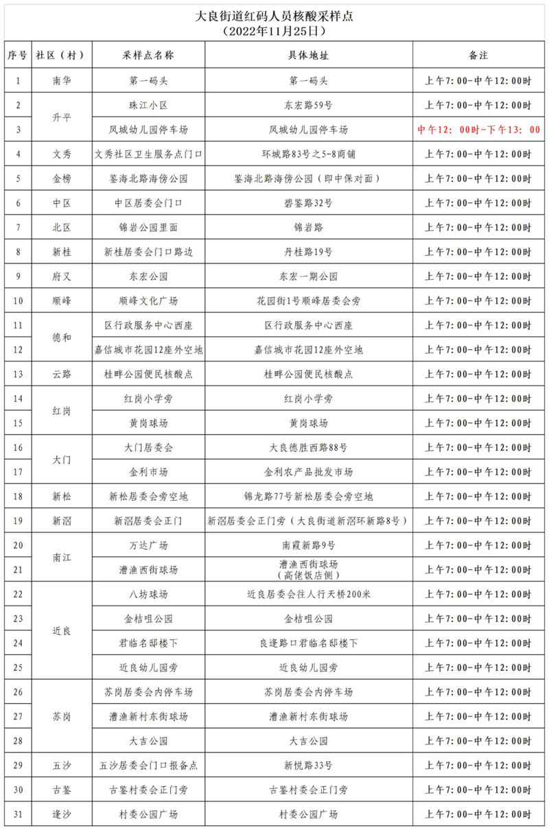 为进一步做好大良街道新冠疫情防控工作,切实保障广大市民群众身体健康和生命安全,定于2022年11月25日在大良街道范围内开展免费核酸检测,并同时提供红码检测服务,现将有关事项通告如下。