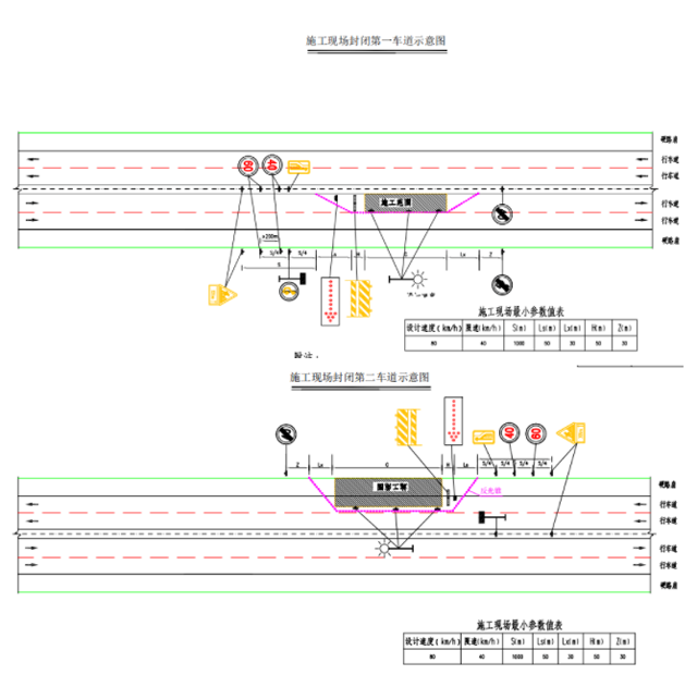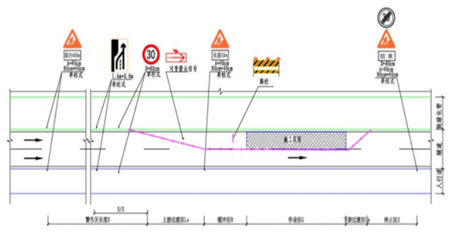 (3)当封闭辅道左侧车道时,设置各种交通标志及限速牌指示牌,将整体行车速度降低,并指引车辆汇入未施工车道,处治完毕后恢复原交通。