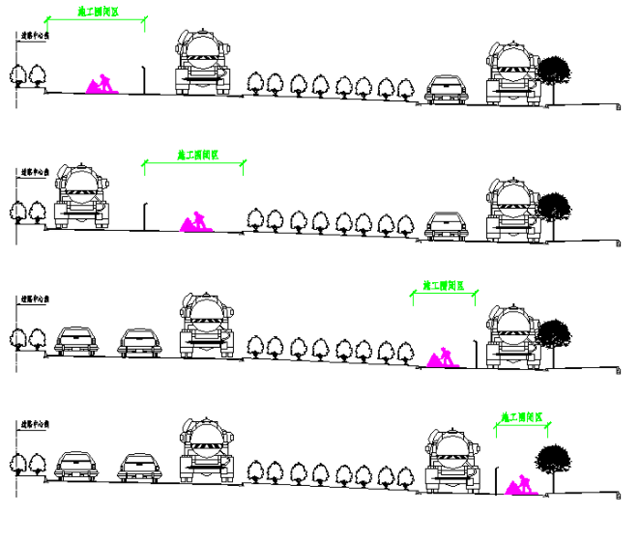 为平衡交通需求和施工需求,主线及辅道路面施工时实行单幅半封闭作业,封闭施工分四个阶段进行,具体施工计划如下: