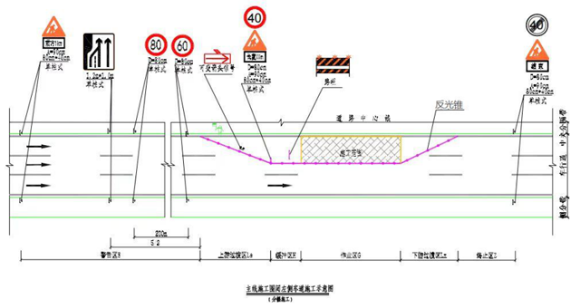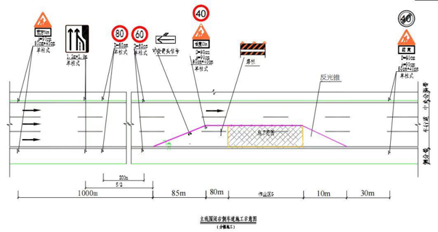 (1)当封闭主线左侧一条半车道时,设置各种交通标志及限速牌,提前将道路缩减为一车道并实现车辆减速,区段施工范围外再将车流转移至未施工侧路面行驶,处治完毕后恢复原交通。