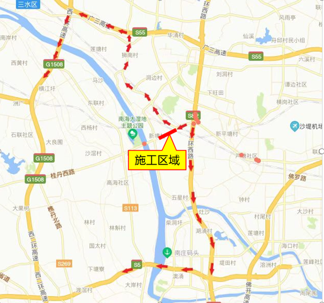 往狮山方向:可提前从桂丹西路转至樵金北路至广台高速或者深海高速绕行。