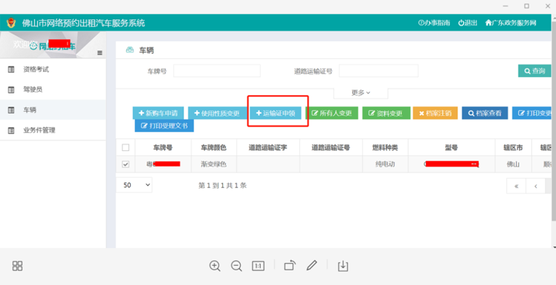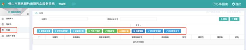 (4)扫码登录“佛山市网络预约出租汽车服务系统”,点击“车辆”,选择需办理的业务