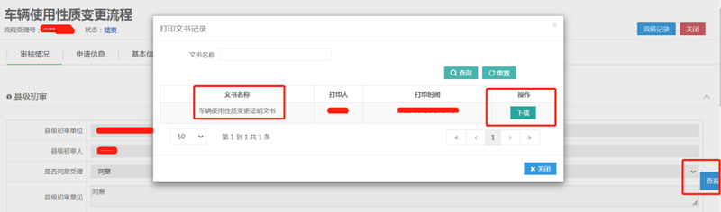 (6)通过审核后在该网站根据所办理业务自行下载打印文书。《佛山市网络预约出租汽车车辆登记变更审核结果》--该文书用于变更车辆行驶证使用性质;《佛山市网约车车辆信息查询结果》--该文书用于变更车辆所有人;《佛山市网络预约出租汽车运输证注销告知书》--该文书用于注销车辆网络预约出租汽车运输证。申请人持自行打印的文书并携带证件材料前往公安局车管部门办理车辆使用性质变更,变更《行驶证》和《车辆登记证》。