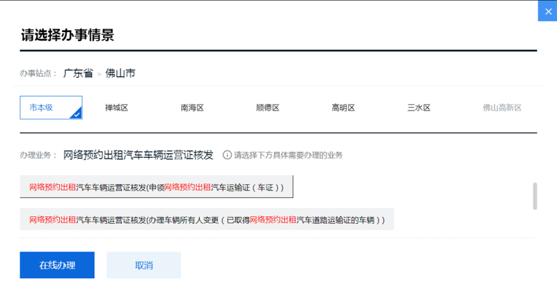 (2)进入网站搜索“网络预约出租汽车”,选择“网络预约出租汽车驾驶员从业资格考试”,在办事指南中点击“在线办理”,扫码登录”佛山市网络预约出租汽车服务系统”或直接点击https://www.gdzwfw.gov.cn/portal/v2/guide/11440600699764863Y344011502800201;