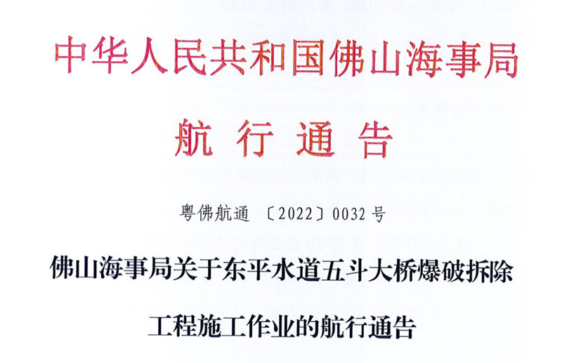 广东省佛山公路集团有限公司需进行S112广杏线五斗大桥段(K8 990-K10 209)重建工程五斗大桥主桥爆破拆除工程施工作业。为确保施工作业顺利进行和船舶航行安全,现将有关事宜通告如下: