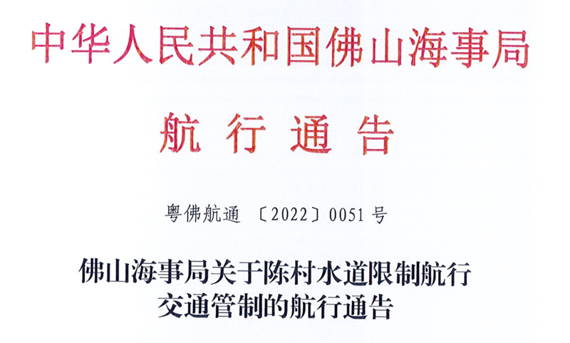 受流域季节性枯水期影响,近期陈村水道三山口至濠滘口航段航道水深下降明显,个别出现浅点,船舶搁浅事故风险急剧增加。为保障航经陈村水道船舶通航安全,需对陈村水道实施限制航行的交通管制,现将有关事宜通告如下: