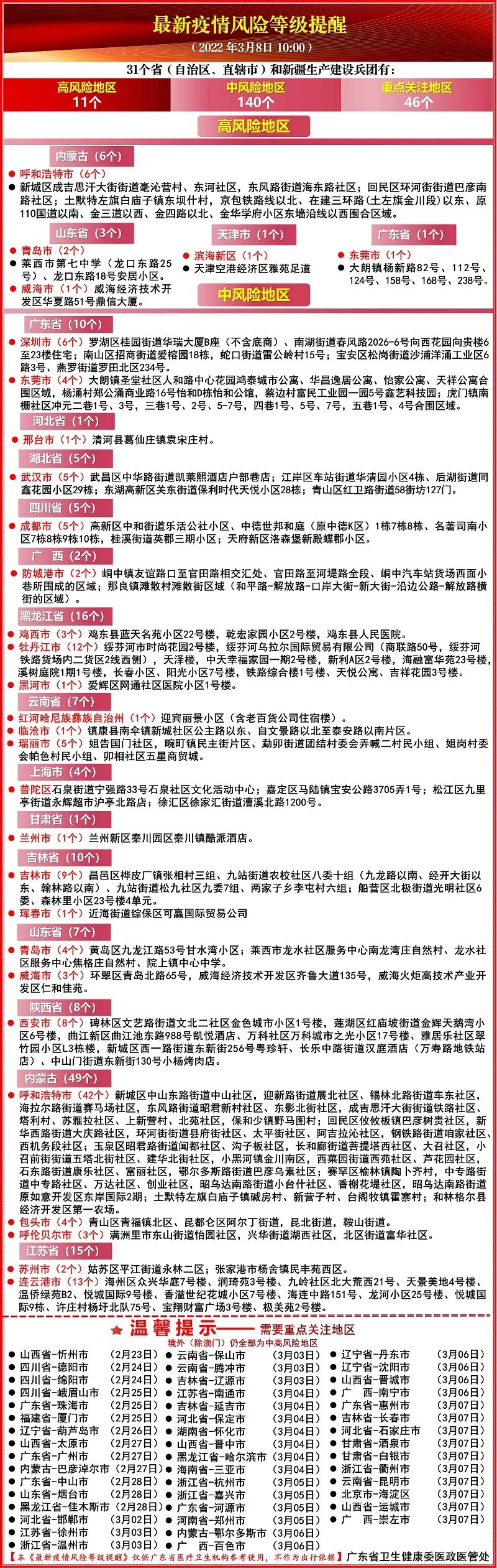 自2022年3月8日凌晨1时起,所有曾经到过以下地点的入境及已入境人士,须按照卫生当局的要求在指定地点接受医学观察至离开当地后14天但最短不少于7天: