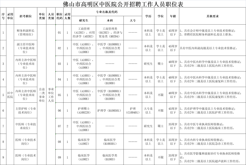 本次招聘工作人员为佛山市高明区中医院事业单位工作人员,人数10名。分别为:中医师2名,医师2名,主治中医师3名,主管护师1名,副主任中医师1名,财务科副科长1名。