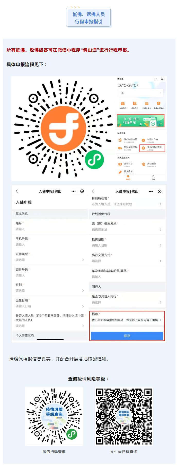 (2)请务必主动通过12345热线、佛山通小程序或直接向所在社区(村)、单位、入住酒店报备。