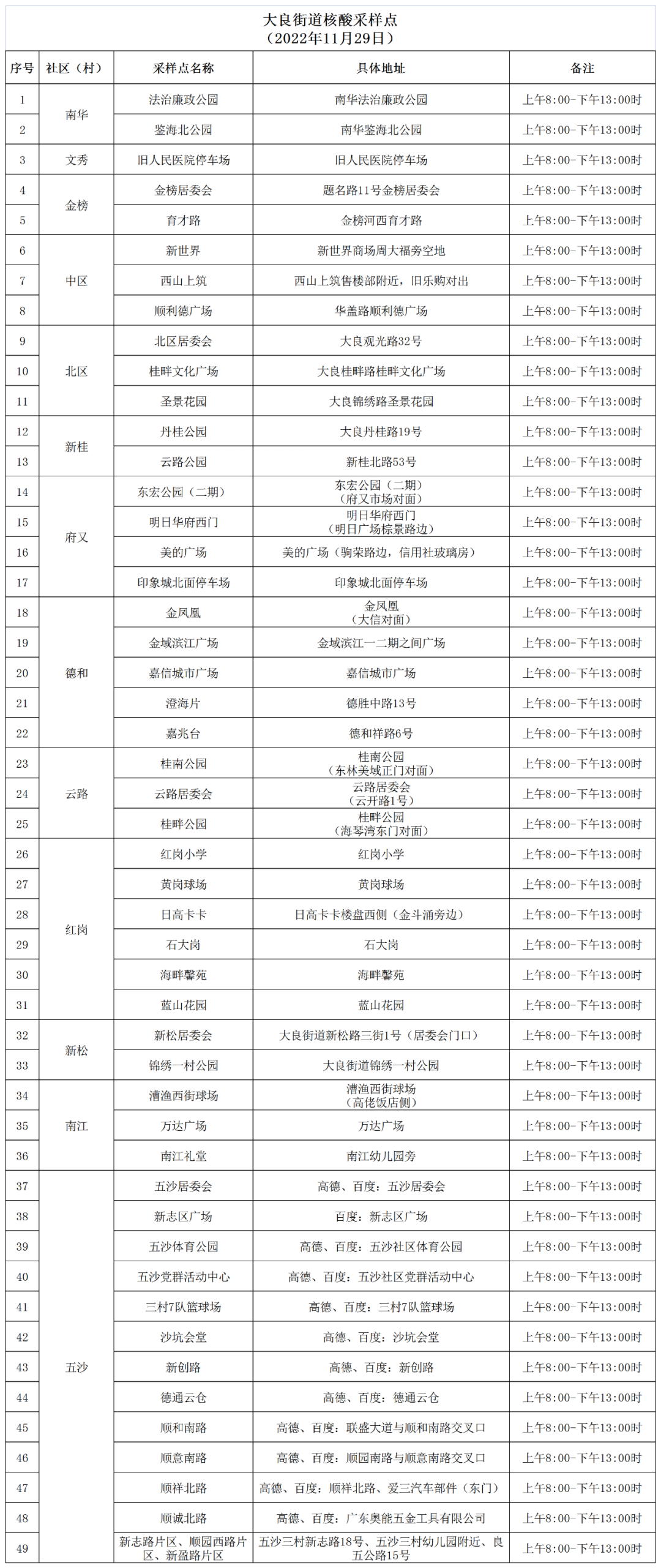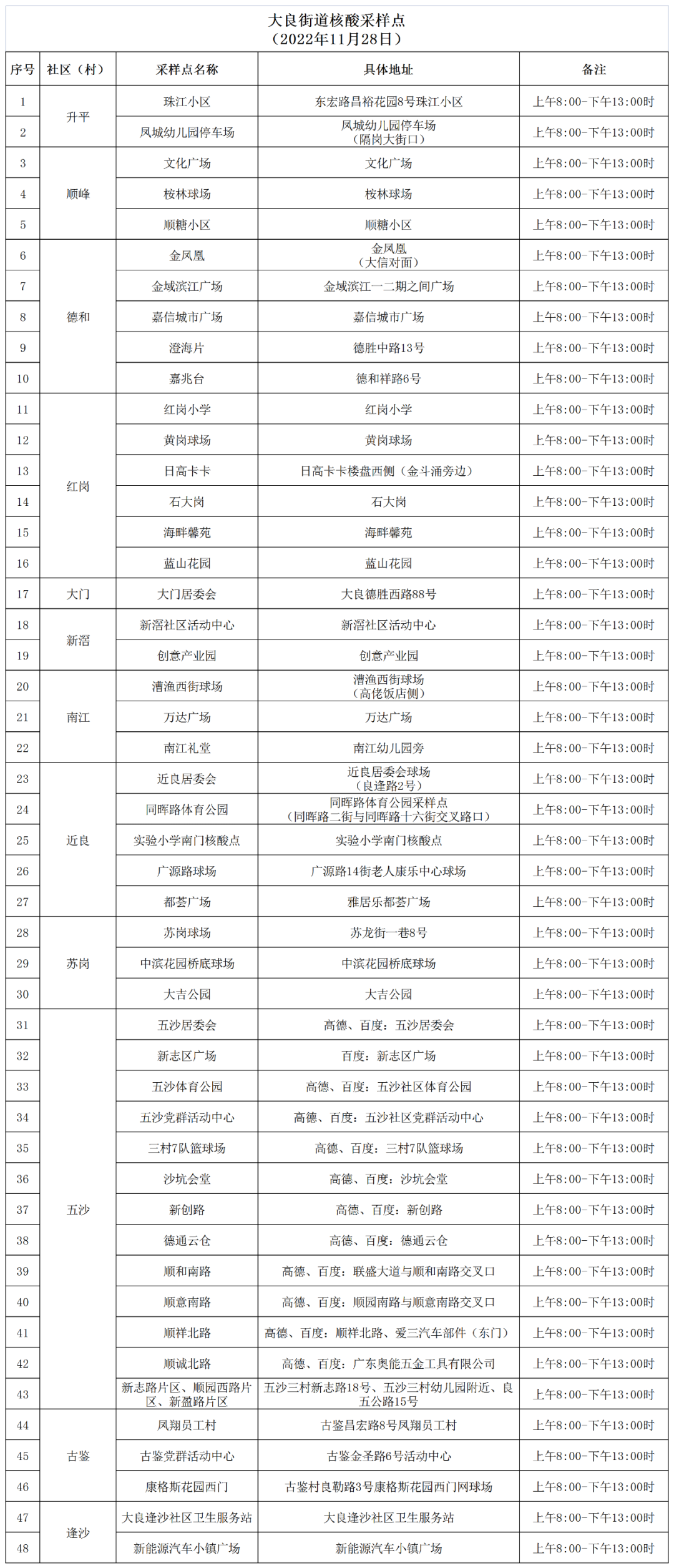 11月28日(星期一)上午8:00-下午13:00时:德和、红岗、南江、五沙,升平、顺峰、大门、新滘、近良、苏岗、古鉴、逢沙等社区(村)开展核酸采样(采样点详见附表1);