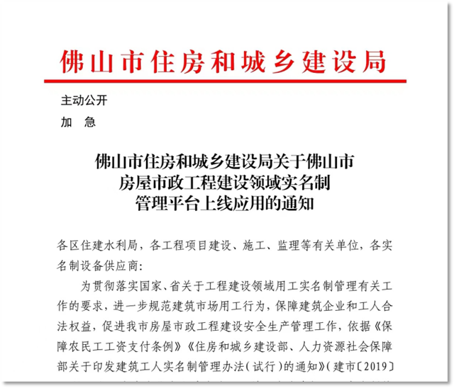佛山市房屋市政工程建设领域实名制管理平台即将正式上线并投入使用,市住房城乡建设局发布了平台上线应用的通知。