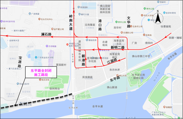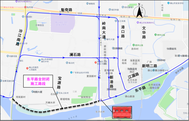 因东平路(东平大桥至汾江南路)路段施工需要,该路段区域将全封闭施工。现将施工区域交通组织调整如下: