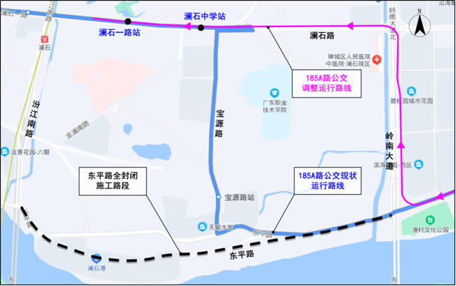 179路公交车西往东方向(禅城区中心医院临时总站-东平大桥公交枢纽站方向)、185A路公交车西往东方向(海景大厦站-奇槎公交枢纽站方向)公交线路保持原有路径通行。