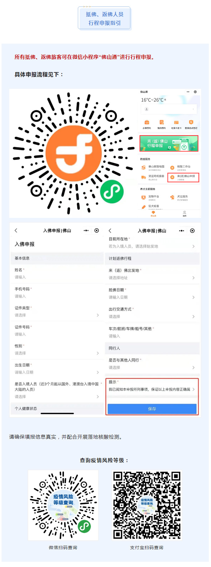 (2)请务必主动通过12345热线、佛山通小程序或直接向所在社区(村)、单位、入住酒店报备。