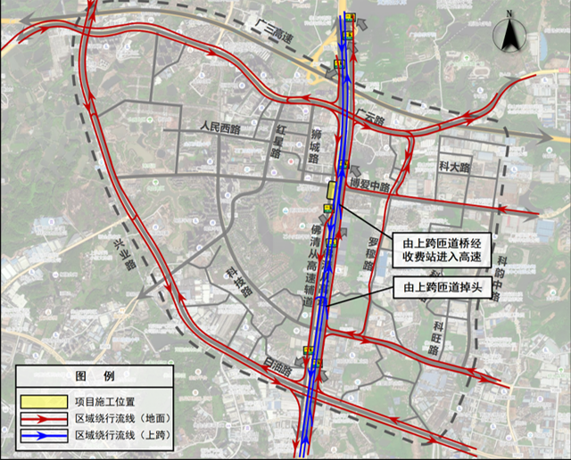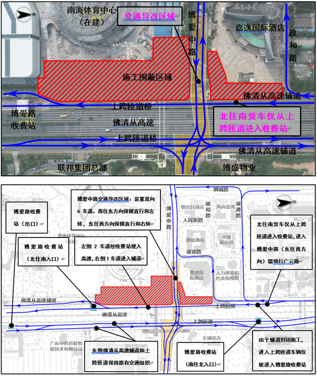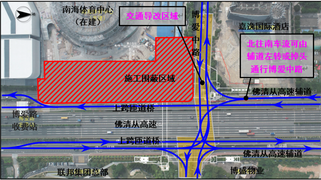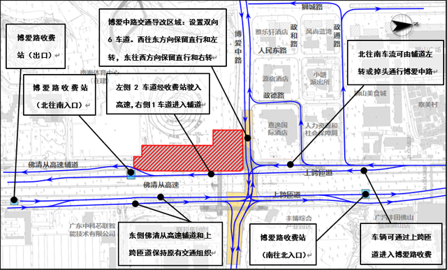 施工区域佛清从高速辅道北往南方向取消直行,保留左转和右转功能;博爱中路交通导改,西往东方向取消右转入佛清从高速辅道,仅保留直行和左转。途经车辆按现场交通指引通行。