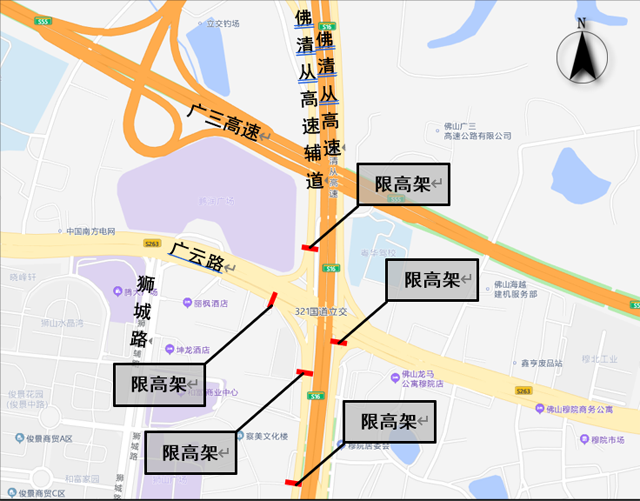 施工期间在佛清从高速辅道北往南方向、广云路辅路西往东右转佛清从高速辅道方向以及佛清从高速辅道南往北掉头方向分别设置限高架(限高2.5米),限制货车通行,货车请按现场指引绕行地方公路。