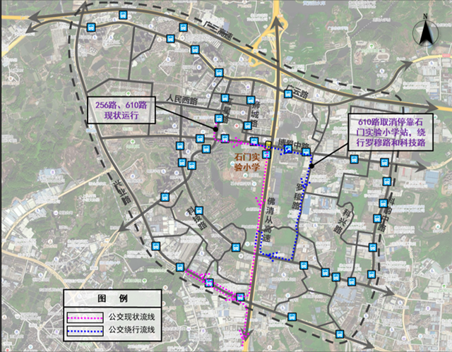 (1)256路、610路:途经施工区域直行博爱中路—罗穆路—科技路—佛清从高速辅道掉头匝道—接回原路线。(其中610路石门实验小学站取消停靠)