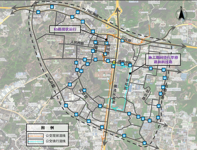 (2)K5路:途经施工区域直行博爱中路—罗穆路—科技路—佛清从高速辅道掉头匝道—接回原路线。