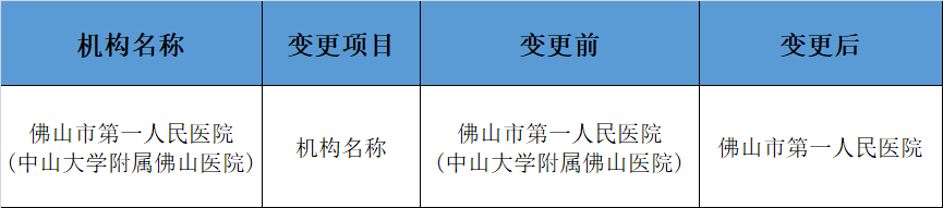 根据《佛山市医疗机构医疗保障定点管理实施办法》(佛医保〔2021〕93 号)的有关规定,佛山市第一人民医院(中山大学附属佛山医院)向我局提交变更医疗机构名称申请,医疗机构名称变更为“佛山市第一人民医院”。经我局审查,同意变更名称后的“佛山市第一人民医院”继续作为我市医疗保险和生育保险定点医疗机构,医保类别维持不变。