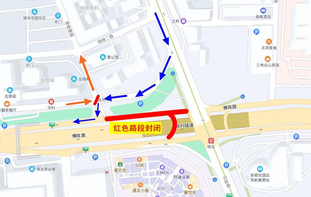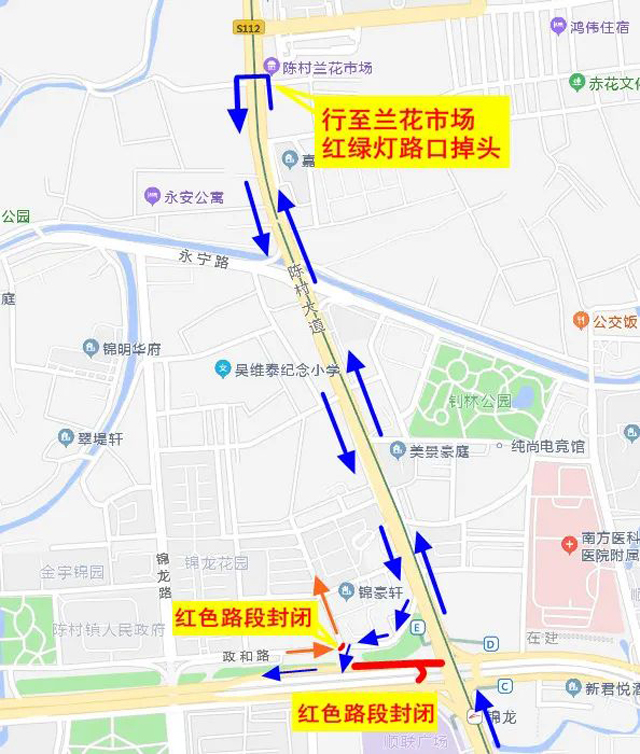原政和路(水业控股陈村分公司)对开路口,将禁止车辆转入佛陈路,往中国电信、税局方向车辆需转入锦绣横路绕道通行。