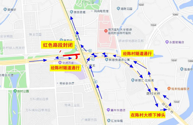 同时,佛陈路从禅城往陈村方向的车辆在该交汇处将不能直接从陈村隧道上方跨线车道掉头,可经陈村隧道通行,在陈村大桥桥底掉头,靠左经陈村隧道通行。如需进入陈村镇,可在沿路出口驶出佛陈路。