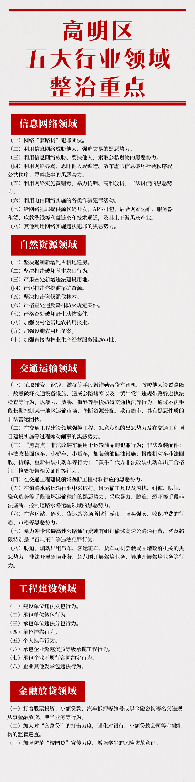 发布会指出,开展好五大行业领域整治既是贯彻落实党中央关于开展重点行业领域整治重大决策部署的政治大事,又是践行以人民为中心的发展思想,回应群众期盼、解决群众疾苦的民生实事;既是持续巩固专项斗争成果的必要之举,又是不断深化常态化扫黑除恶斗争的治本之策;既是推进市域社会治理现代化试点工作的重要抓手,又是助力实施“一号改革工程”,营造公平、法治、便捷、透明市场环境的有力举措,必将为高明区加快追赶超越、实现全域高质量发展打下坚实基础、提供坚强保障。高明区将坚持问题导向、结果导向,全面排查治理短板,及时堵塞监管漏洞,纵深推进行业领域整治工作,确保取得党和人民满意的实际成效。一是在强化“打击”上下功夫,聚焦重点加紧打击、聚焦线索集中打击、聚焦“伞网”精准打击;二是在强化“防控”上下功夫,斩断黑灰产业链、构筑社会防护网、规范行业经营秩序;三是在强化“监管”上下功夫,突出重点监管、完善动态监管、强化日常监管;四是在强化“立制”上下功夫,推动政策措施更加完备、“两法”衔接更加紧密、长效常治更加有力;五是在强化“责任”上下功夫,督促相关单位扛起牵头责任、履行主体责任、落实协同责任,锚定目标、担责尽责,确保整治到位有效。