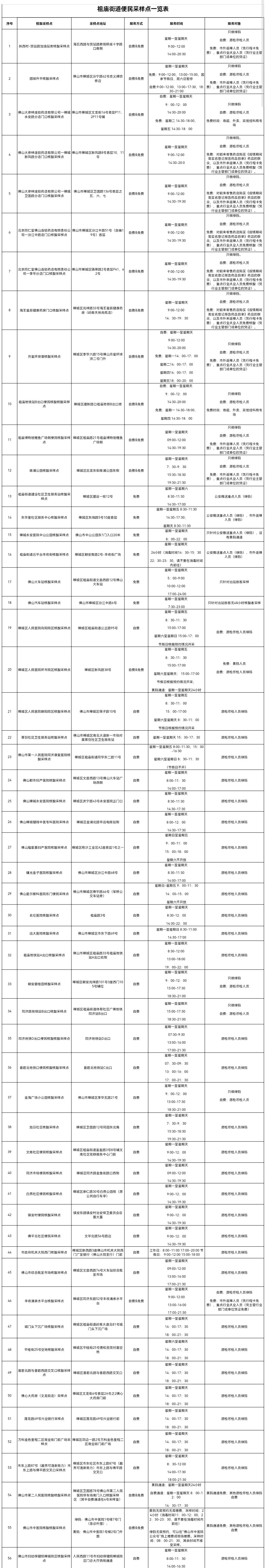 截至11月30日,祖庙街道共设置56个便民核酸采样点,为了保障广大市民的身体健康,请市民朋友根据自身需求,对照《祖庙街道辖区便民核酸采样点一览表》内“服务对象”栏对应的服务人群信息选择相应采样点,在“服务时间”内前往检测,做到应检尽检、愿检尽检。