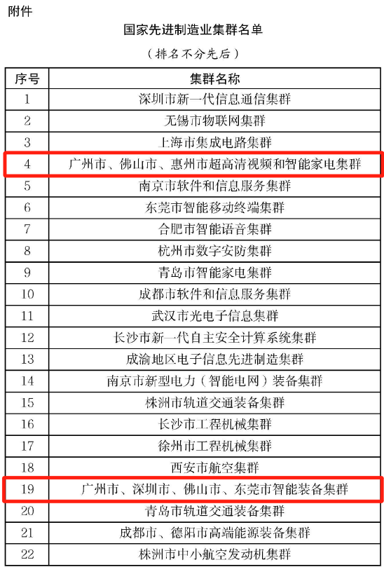 此次入围名单的广州市、佛山市、惠州市超高清视频和智能家电集群,于2019年9月入围国家先进制造业集群首批培育对象。围绕这一集群,佛山制定《佛山市打造万亿规模先进装备制造业产业基地工作方案》,从智能家电延伸到智能家居,推进培育超万亿的泛家居先进制造业产业集群,培育了美的、格兰仕、海信科龙等一批龙头企业。
