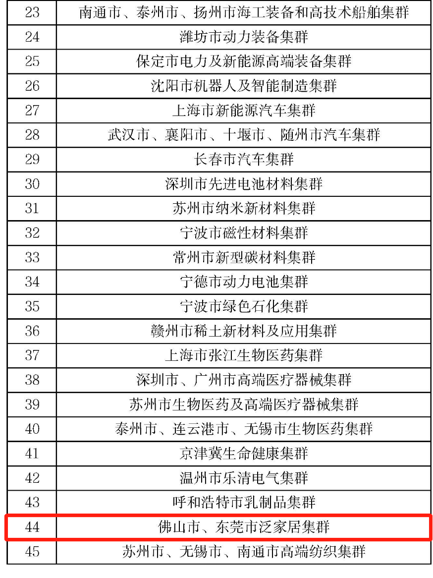 此外,进入先进制造业产业集群“国家队”的还有佛山市、东莞市泛家居集群。佛莞泛家居产业带有约40年的发展历程,培育出了由陶瓷、家具、地板、金属材料、纺织、五金、电气等细分行业组成的泛家居产业。