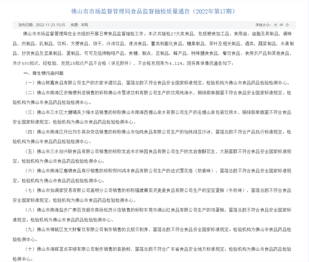 佛山市市场监督管理局在全市组织开展日常食品监督抽检工作。本次共抽检27大类食品,包括粮食加工品,食用油、油脂及其制品,调味品、肉制品、乳制品、饮料、方便食品、饼干、冷冻饮品、速冻食品、薯类和膨化食品,糖果制品、茶叶及相关制品,酒类、蔬菜制品、水果制品、炒货食品及坚果制品,蛋制品、可可及焙烤咖啡产品,食糖、糕点、豆制品、蜂产品、特殊膳食食品、餐饮食品、食用农产品和其他食品,共计680批次。经检验,发现28批次产品不合格(详见附件),不合格发现率为4.12%。