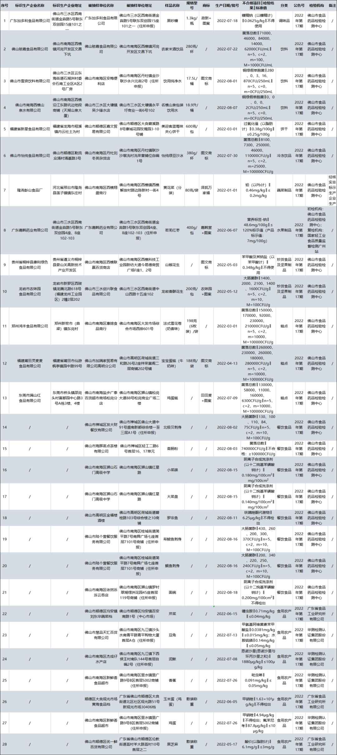 不合格28批次产品不合格名单