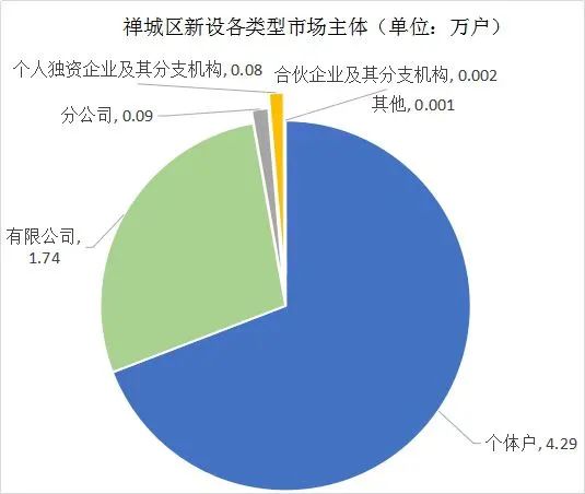 从增量看,2021年禅城区新设市场主体6.19万户,较2020年同比增长50.04%,较2019年增长90.67%。2021年平均每天新增169个“老板”。其中企业1.90万,日均新设52户,个体户4.29万,日均新设117户。