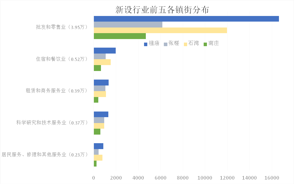 新设市场主体排名前五位的行业分别为“批发和零售业” “住宿和餐饮业”“租赁和商务服务业”“科学研究和技术服务业”“居民服务、修理和其他服务业”。其中“批发和零售业”占新设立总数的63.73%。