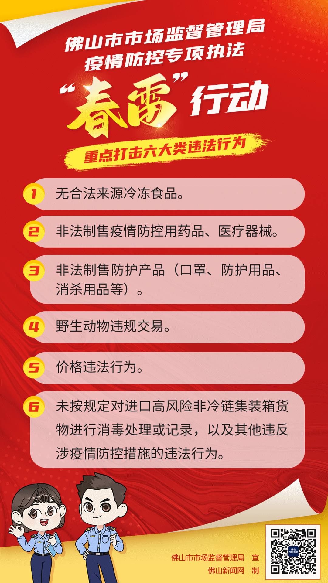 为进一步做好市场监管领域疫情防控工作,严厉打击疫情防控相关违法行为,1月15日至3月15日,佛山市市场监督管理局开展为期两个月的疫情防控专项执法“春雷”行动,集中力量开展检查、督查疫情防控措施落实情况,查办一批案件,大力维护良好的市场秩序,保护群众生命安全和身体健康。