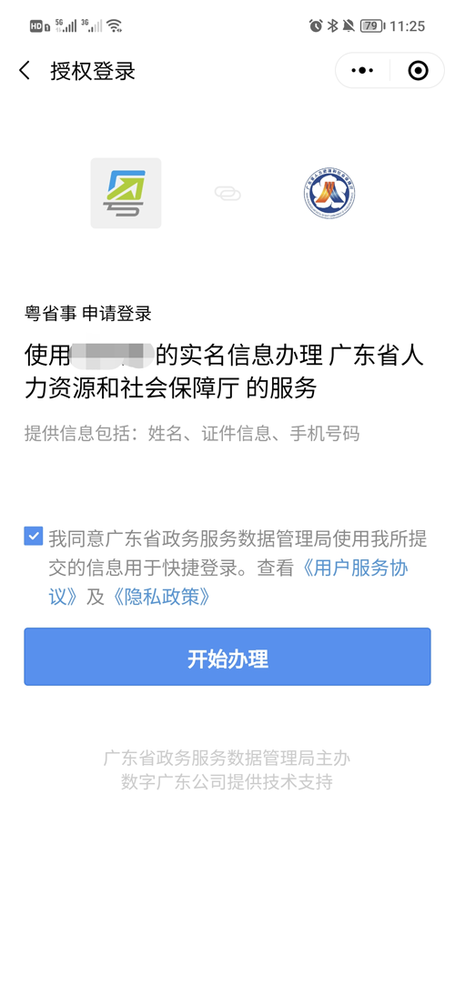 查看《用户服务协议》和《隐私政策》,同意继续办理的,【勾选】后点击【开始办理】进行授权登录。