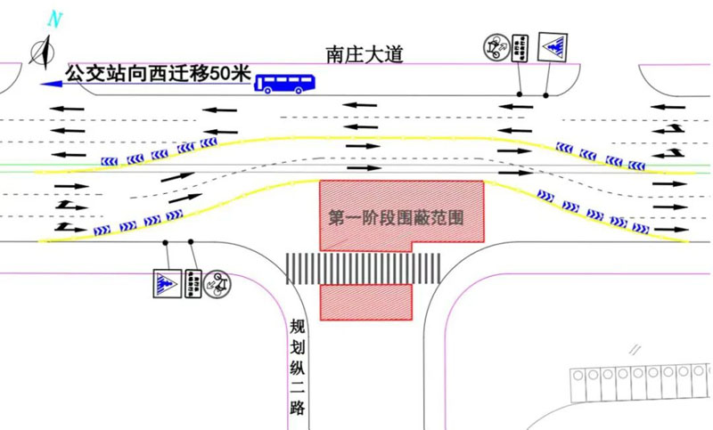 公交站迁移方案:南庄大道北侧公交站南庄道班站向西侧迁移50米,设置临时停靠站。