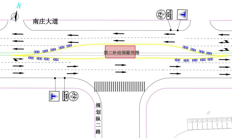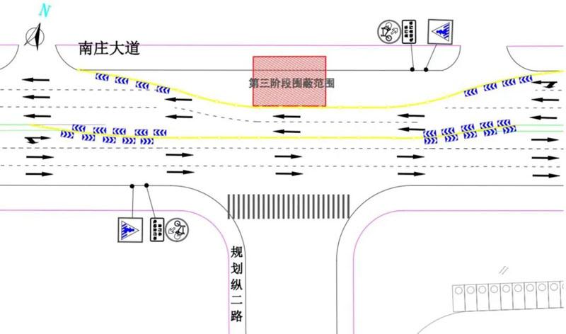 机动车疏解方案:第二阶段施工围蔽结束后,利用围蔽区域设置两条机动车车道,组织南庄大道东往西方向机动车通行;利用南庄大道第一阶段施工围蔽区域恢复两条机动车道,组织南庄大道西往东方向机动车通行。