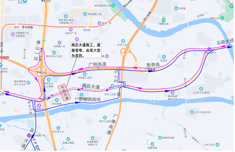 南庄大道/吉利大道—佛山一环辅路—广明高速辅路—中心街—南庄大道;