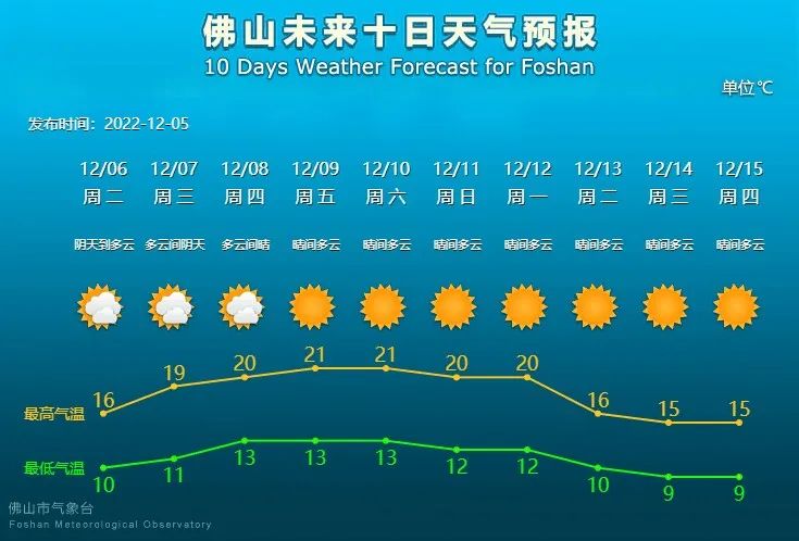 未来10天,佛山天气模式或表现为6日阴天到多云,12月7日起可见阳光,转晴燥,宜洗晒。