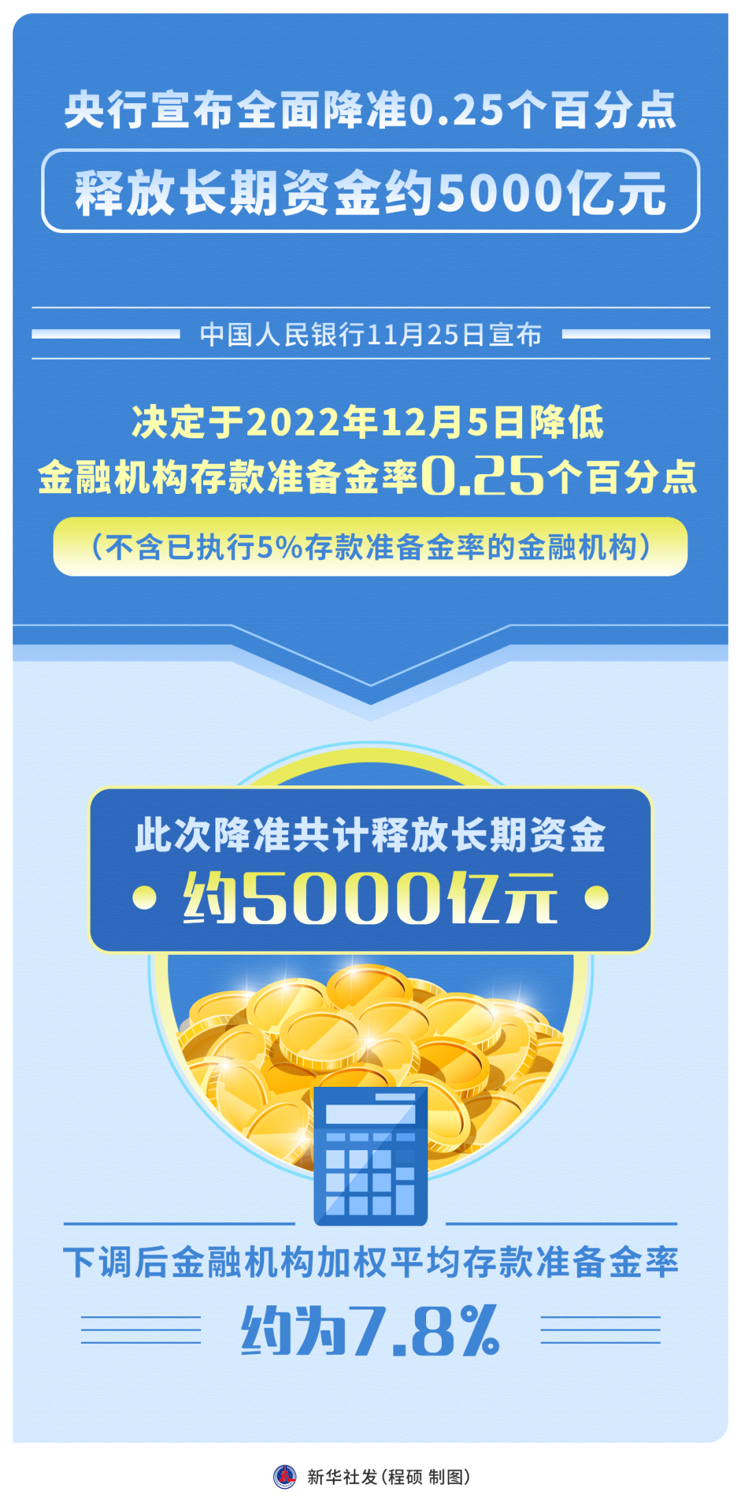 11月25日中国人民银行宣布,决定于2022年12月5日降低金融机构存款准备金率0.25个百分点(不含已执行5%存款准备金率的金融机构)。这是年内第二次降准,今年首次降准已在4月落地。两次降准共降低金融机构存款准备金率0.5个百分点、释放长期资金超万亿元,金融机构加权平均存款准备金率降至约7.8%。